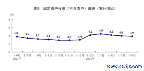 上半年,全国固定资产投资(不含农户)245391亿元,同比增长3.9%;扣除房地产开发投资,全国固定资产投资增长8.5%。分领域看,基础设施投资增长5.4%,制造业投资增长9.5%,房地产开发投资下降10.1%。全国新建商品房销售面积47916万平方米,同比下降19.0%;新建商品房销售额47133亿元,下降25.0%。分产业看,第一产业投资增长3.1%,第二产业投资增长12.6%,第三产业投资下降0.2%。民间投资增长0.1%;扣除房地产开发投资,民间投资增长6.6%。高技术产业投资同比增长10.6%,其中高技术制造业和高技术服务业投资分别增长10.1%、11.7%。高技术制造业中,航空、航天器及设备制造业,计算机及办公设备制造业投资分别增长38.3%、12.1%;高技术服务业中,电子商务服务业、科技成果转化服务业投资分别增长24.1%、17.4%。6月份,固定资产投资(不含农户)环比增长0.21%。