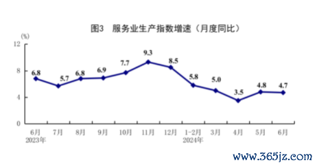 上半年,服务业增加值同比增长4.6%。其中,信息传输、软件和信息技术服务业,租赁和商务服务业,交通运输、仓储和邮政业,住宿和餐饮业,批发和零售业增加值分别增长11.9%、9.8%、6.9%、6.6%、5.7%。6月份,全国服务业生产指数同比增长4.7%。其中,信息传输、软件和信息技术服务业,租赁和商务服务业,交通运输、仓储和邮政业生产指数分别增长13.5%、9.7%、5.4%。1-5月份,规模以上服务业企业营业收入同比增长8.5%。6月份,服务业商务活动指数为50.2%;服务业业务活动预期指数为57.6%,比上月上升0.6个百分点。其中,航空运输、邮政、电信广播电视及卫星传输服务、货币金融服务、保险等行业商务活动指数位于55.0%以上较高景气区间。