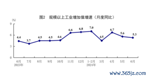 上半年,全国规模以上工业增加值同比增长6.0%。分三大门类看,采矿业增加值增长2.4%,制造业增长6.5%,电力、热力、燃气及水生产和供应业增长6.0%。装备制造业增加值增长7.8%,高技术制造业增加值增长8.7%,增速分别快于全部规模以上工业1.8和2.7个百分点。分经济类型看,国有控股企业增加值增长4.6%;股份制企业增长6.5%,外商及港澳台投资企业增长4.3%;私营企业增长5.7%。分产品看,3D打印设备、新能源汽车、集成电路产品产量同比分别增长51.6%、34.3%、28.9%。6月份,规模以上工业增加值同比增长5.3%,环比增长0.42%。6月份,制造业采购经理指数为49.5%,与上月持平;企业生产经营活动预期指数为54.4%,比上月上升0.1个百分点。1-5月份,全国规模以上工业企业实现利润总额27544亿元,同比增长3.4%。
