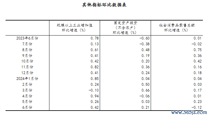 (2)根据季节调整模型自动修正结果,对近一年来各期国内生产总值、规模以上工业增加值、固定资产投资(不含农户)、社会消费品零售总额环比增速进行修订。修订结果及2024年二季度GDP环比数据、2024年6月份其他指标环比数据如下:
