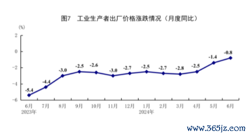 上半年,全国工业生产者出厂价格同比下降2.1%,降幅比一季度收窄0.6个百分点。其中,6月份同比下降0.8%,环比下降0.2%。上半年,工业生产者购进价格同比下降2.6%。其中,6月份同比下降0.5%,环比上涨0.1%。